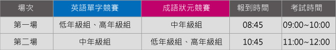 A12:「英語單字競賽」和「成語狀元競賽」的出題範例請參考第十五點、第十六點,出題範圍都以單字本及成語集為限。