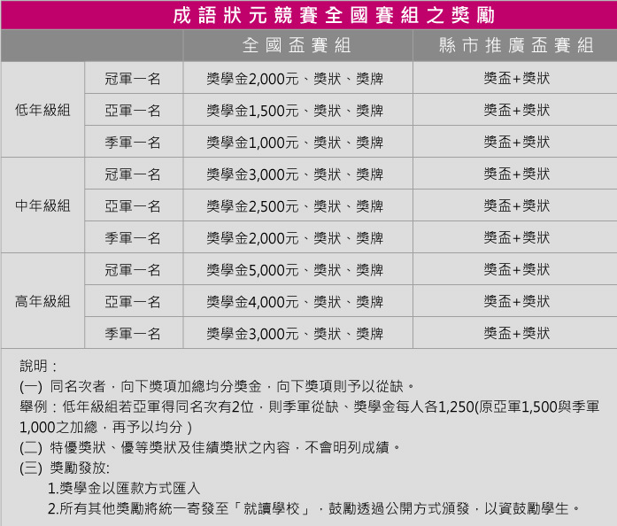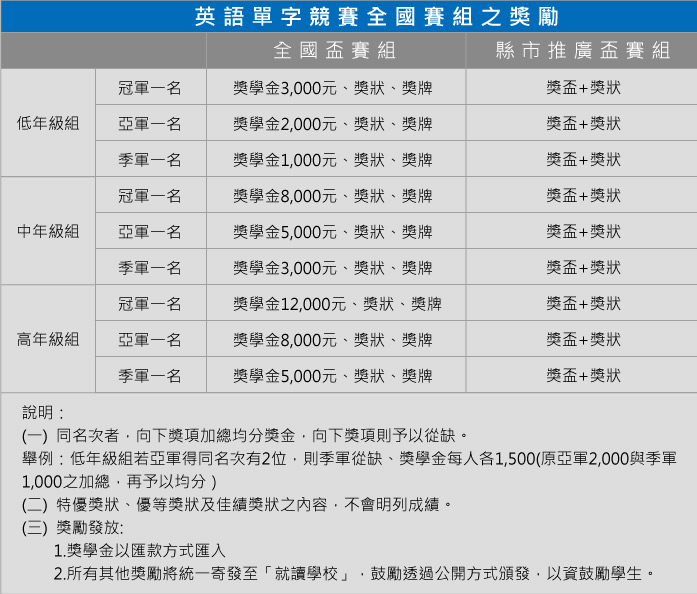 (得獎基本條件: 競賽成績需達優等成績(英語單字: 70分、成語狀元: 70分)