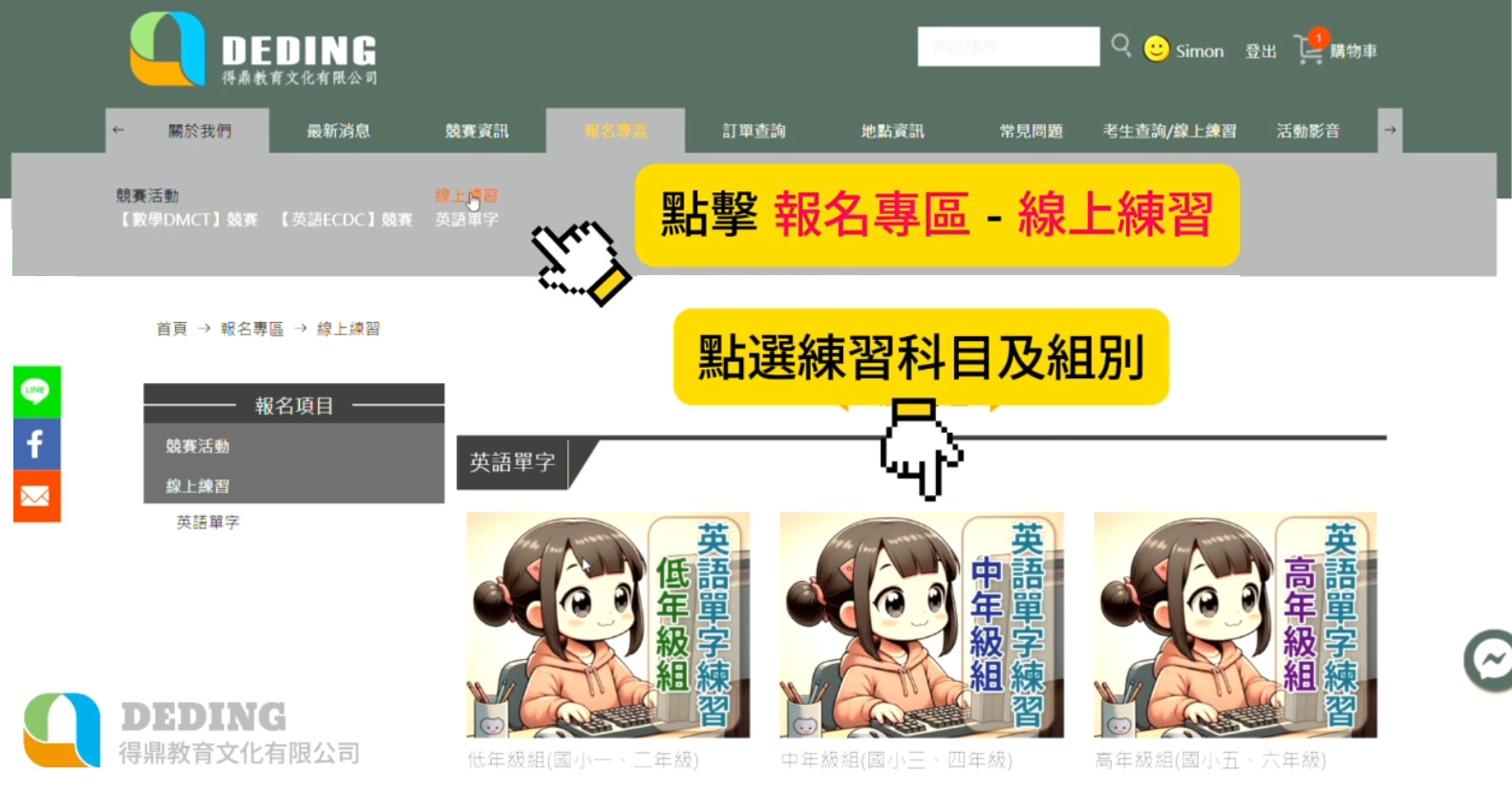 1.如果您需要練習其他項目(已報名競賽項目的話可略過此步驟),請先前往「報名專區」→「線上練習」,選擇想要練習的科目或組別。如果想要多項練習,也可以全部選擇,一次報名即可。報名練習不需費用,僅在實際使用時才會扣除紅利點數,請安心選擇!