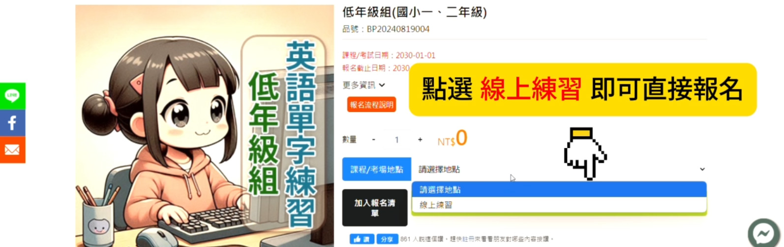 2.課程/考場地點選擇 "線上練習",然後直接報名。