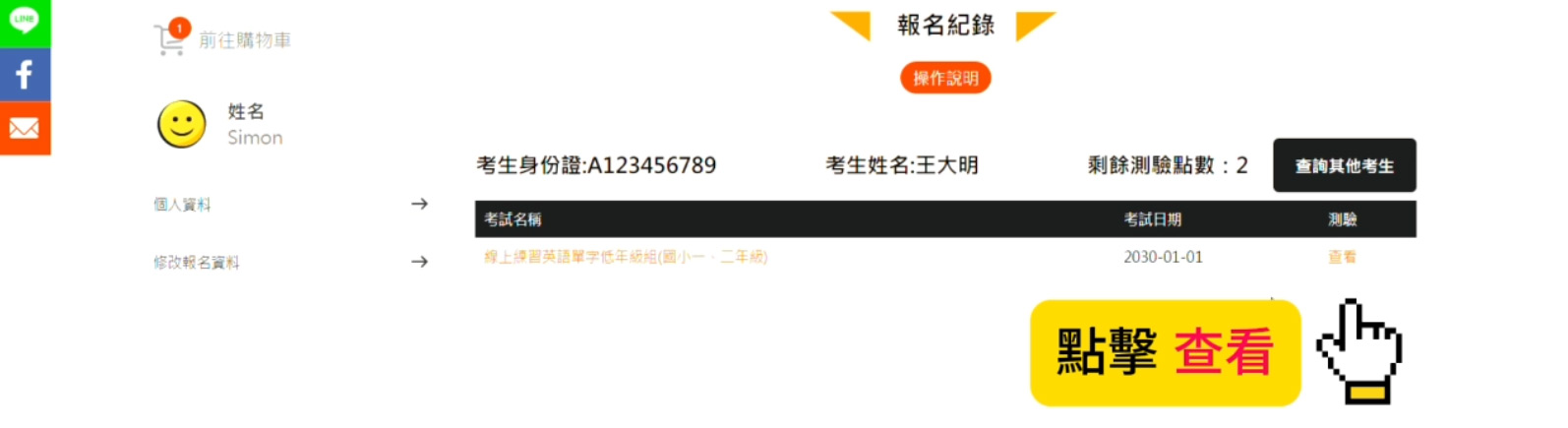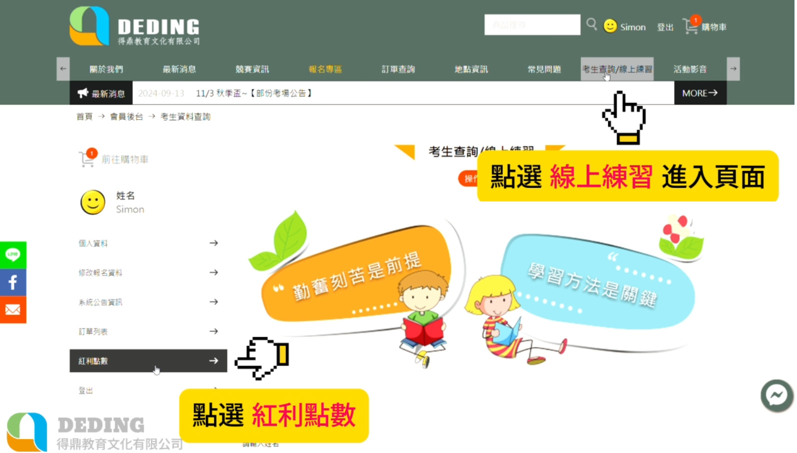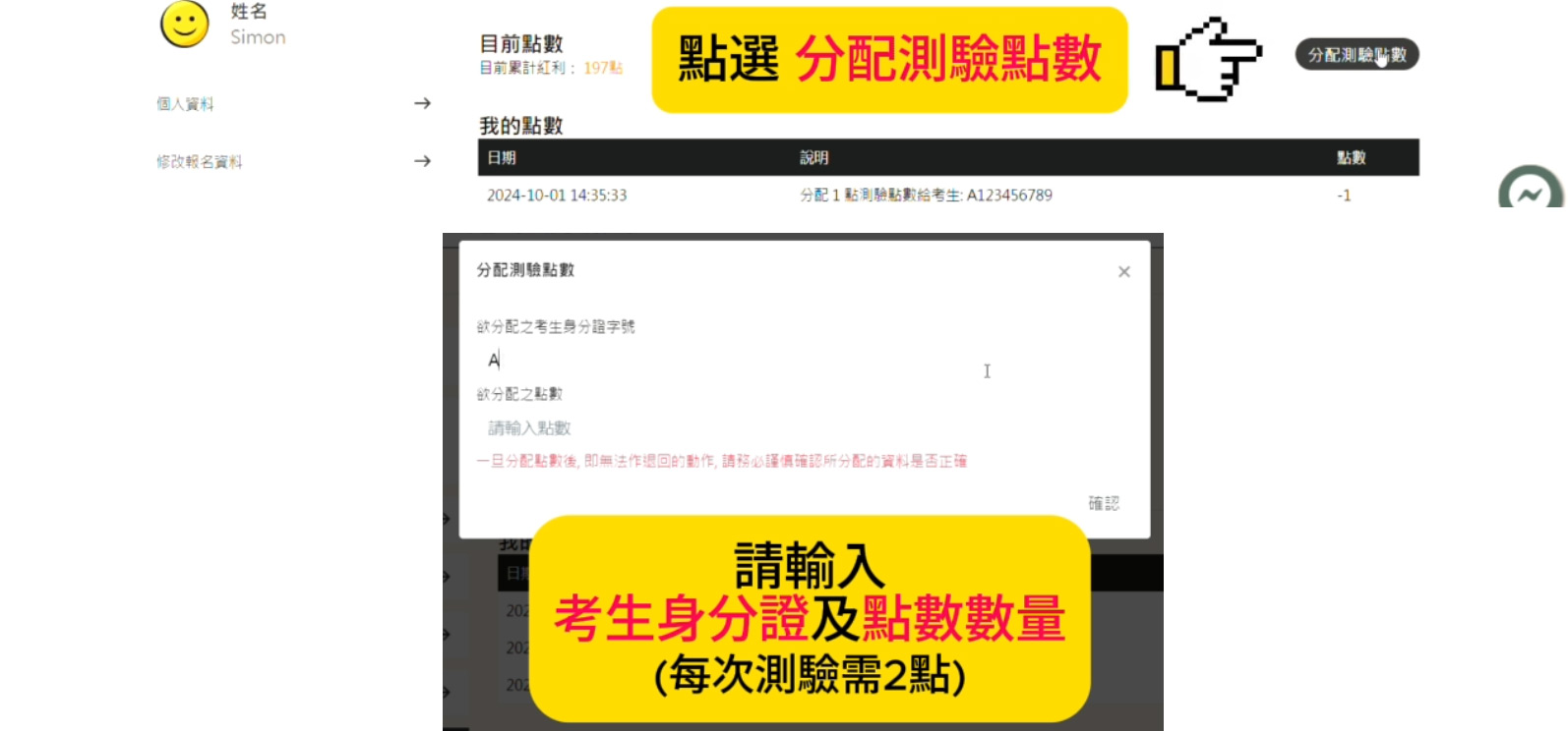 登入會員,然後點選會員資料或是考生查詢/線上練習都可以,進入個人資料裡面,再點選"紅利點數",然後按分配測驗點數,輸入考生的身分證號碼及要分配的點數(每次測驗需要2點),在按確認即可。
