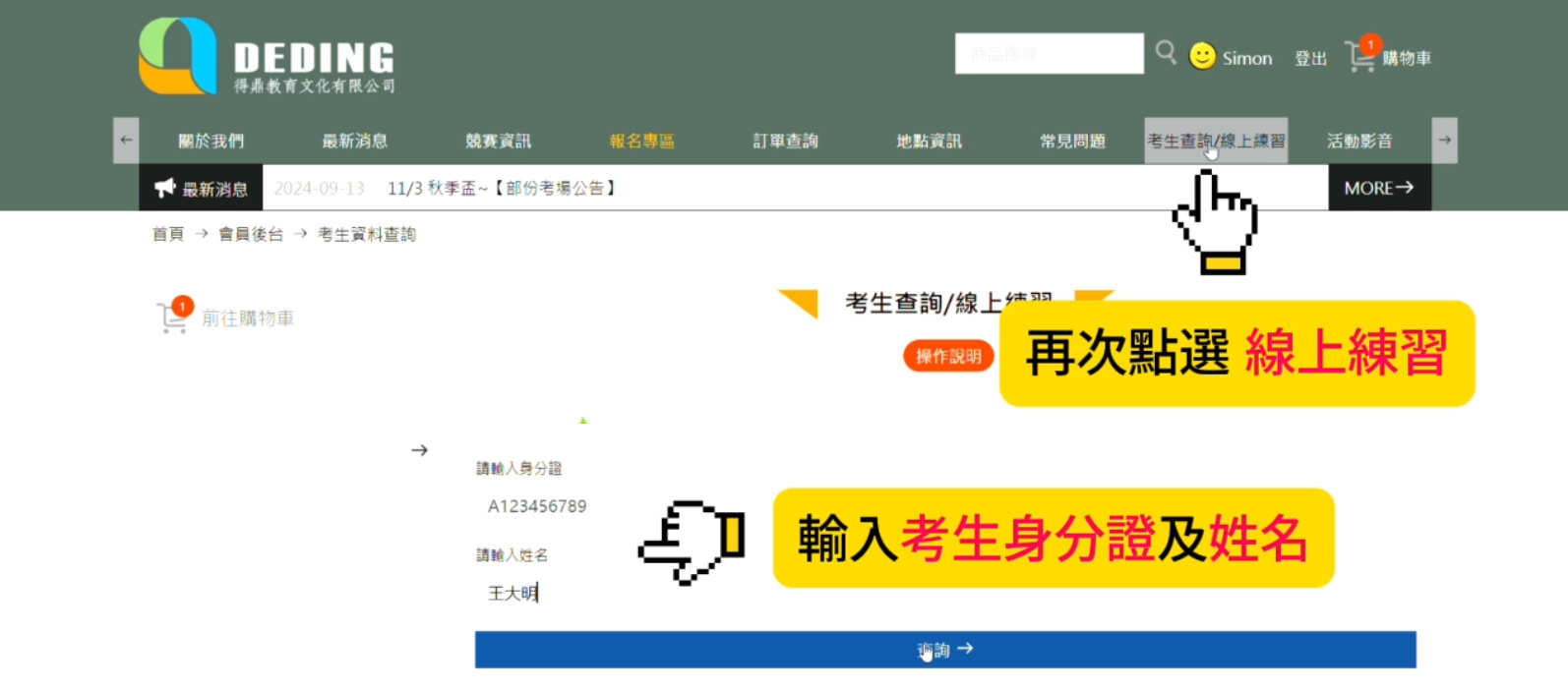 1.點選考生查詢/線上練習,輸入考生身分證及考生姓名,然後按下查詢