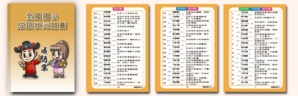 2.成語狀元競賽:比賽時以得鼎教育文化所發行的成語集為命題基準,「成語集」以教育部成語典內容,選錄952個成語(含釋義)編輯成冊。(詳細請參考測驗內容/範圍)