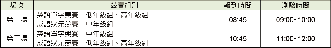 ●英語單字競賽區分為三組:低年級組(國小一、二年級)、中年級組(國小三、四年級)、高年級組(國小五、六年級)。