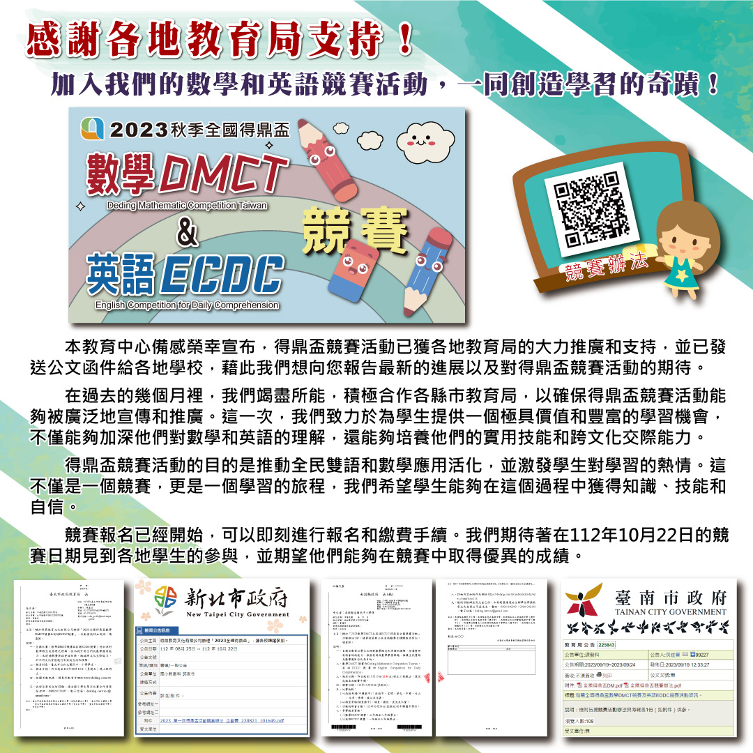 本教育中心備感榮幸,得鼎盃競賽活動已獲各地教育局的大力推廣和支持,並已發送公文函件給各地學校,藉此我們想向您報告最新的進展以及對我們活動的期待。