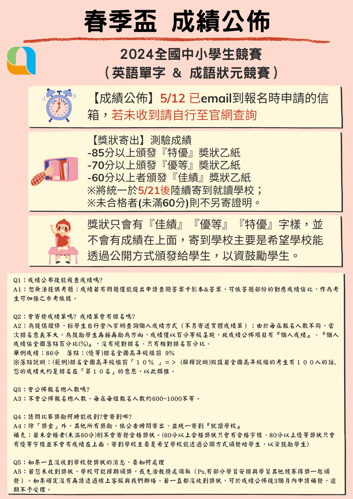 [得獎基本條件: 競賽成績需達優等成績(英語單字: 70分、成語狀元: 70分)]