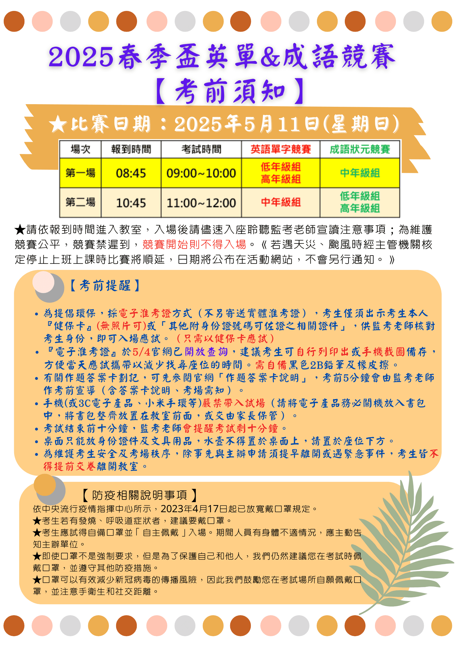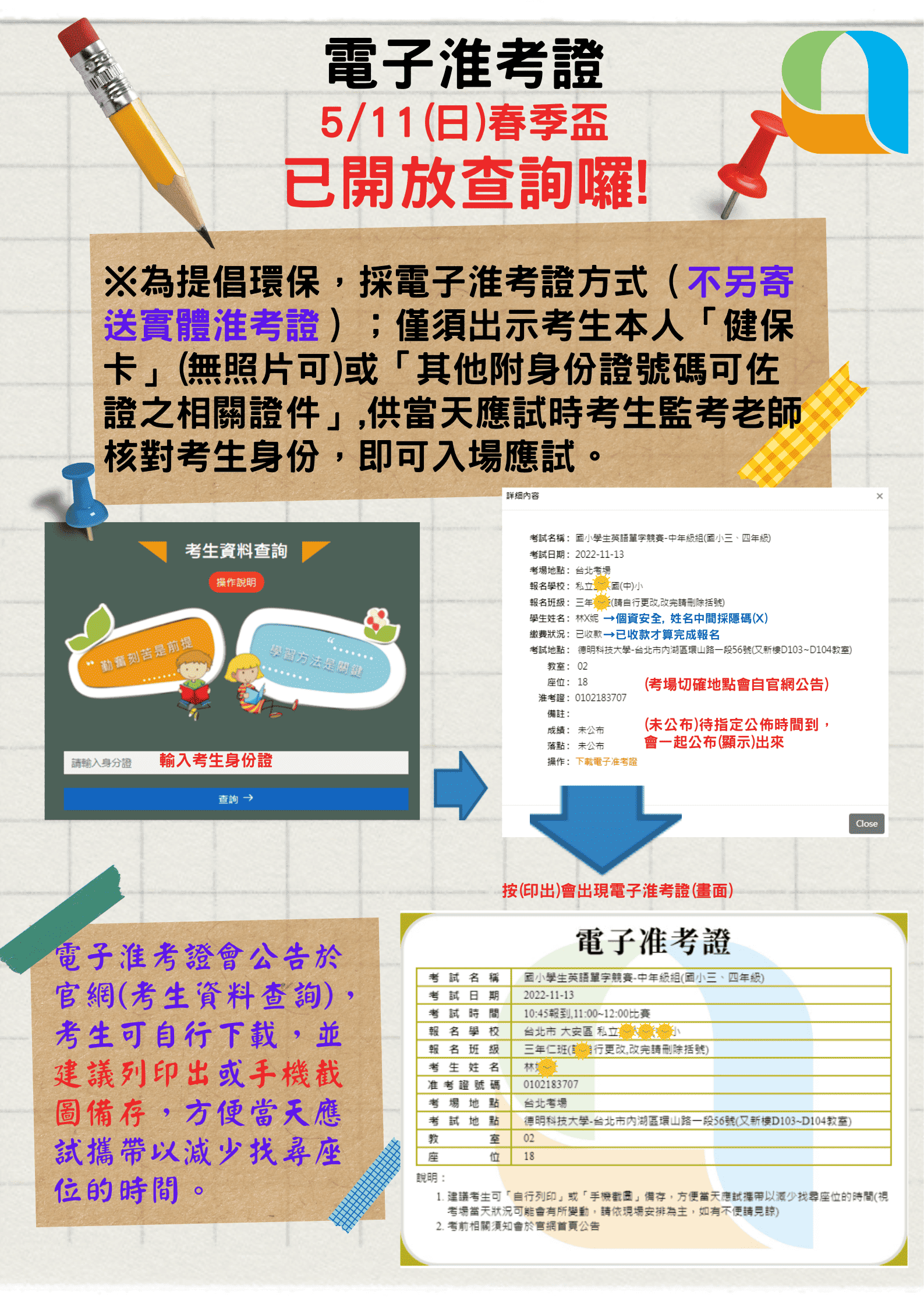 春季盃~已開放查詢【5/11電子准考證&考前須知】