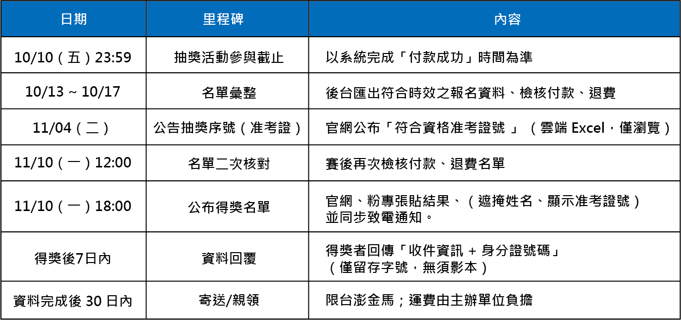 - ◆ 得獎者應於通知後 7 日內回覆 收件資訊+身分證字號,並簽署領獎收據;逾期或資料不全者,視同放棄,將重新抽選遞補。