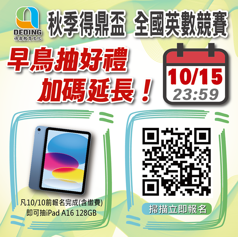 「2025秋季得鼎盃早鳥抽獎活動」延長至 10/15(二)23:59 截止。